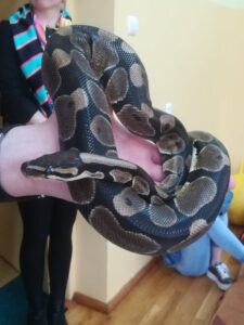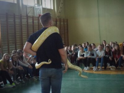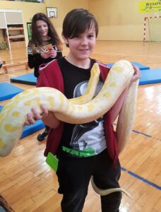 Podczas lekcji poruszane są również tematy dotyczące rodzimych gatunków węży – jak rozpoznać spotkanie z nimi w naturze, jak się zachować oraz jaką rolę pełnią w ekosystemie.